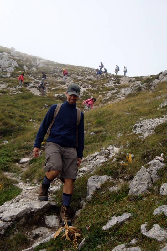 Il tempo imbruttisce un po', le nuvole si addensano su di noi e sulla cima, tira un po' di vento ma fortunatamente non piove.